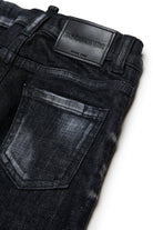 Five-pockets jeans. Made of black denim, distinguished by gradients and colour-contrasting whiskers. Turn-up bottom hem with inside-out effect. Dsquared2 label applied to the flap (flag logo).