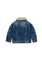 Dark blue denim trucker jacket with dirty effect. The collar and teddy inner make it warm and soft. An authentic and refined garment, typical of Diesel DNA.