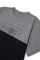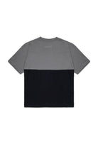 Short-sleeved T-shirt in soft two-tone cotton jersey, featuring a re-cut construction that simulates the assembly of two deconstructed and reassembled garments. A garment that embodies MM6's signature DNA.