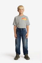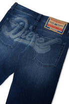 - Medium blue denim with lived-in details and a faded-effect logo on the back