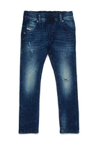 Krooley regular-fit jeans in dark blue denim with breaks and sporty attitude. A straight-cut design with a tapered leg that is looser on the thigh and gradually tapers toward the ankle. A worn-looking jeans that adds a touch of personality to any outfit.