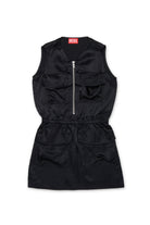 Short dress with logo and patch pockets. The model features a front zip closure, elasticated waist, and fabric with a satin finish.
