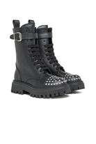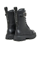 Leather combat boots with decorative studs on the toe and buckle strap placed on the top of the shaft. A perfect model to add a rock and bold touch to any look.