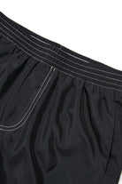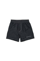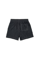 Short boxer swim trunks with logo on the hem. Essential beachwear design with technical details.