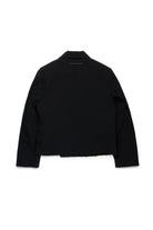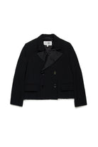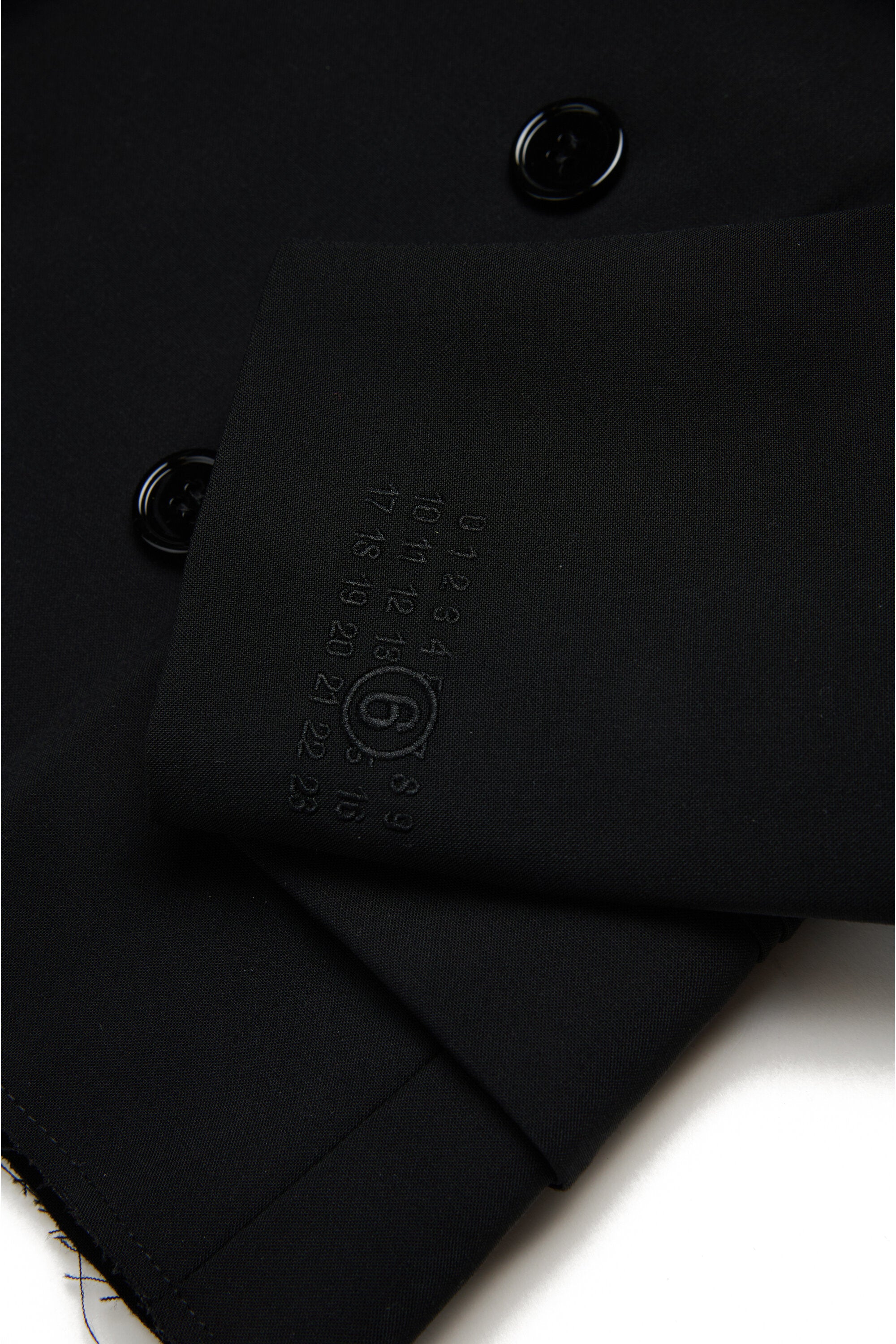 Long-sleeved blazer jacket in cool wool. Shiny satin lapels. Front features a tone-on-tone embroidered institutional logo. Raw edge details on the bottom. Front flap pockets. Double-breasted closure. Iconic seam at back. Viscose inner lining. A special garment, ideal for parties and ceremonies.