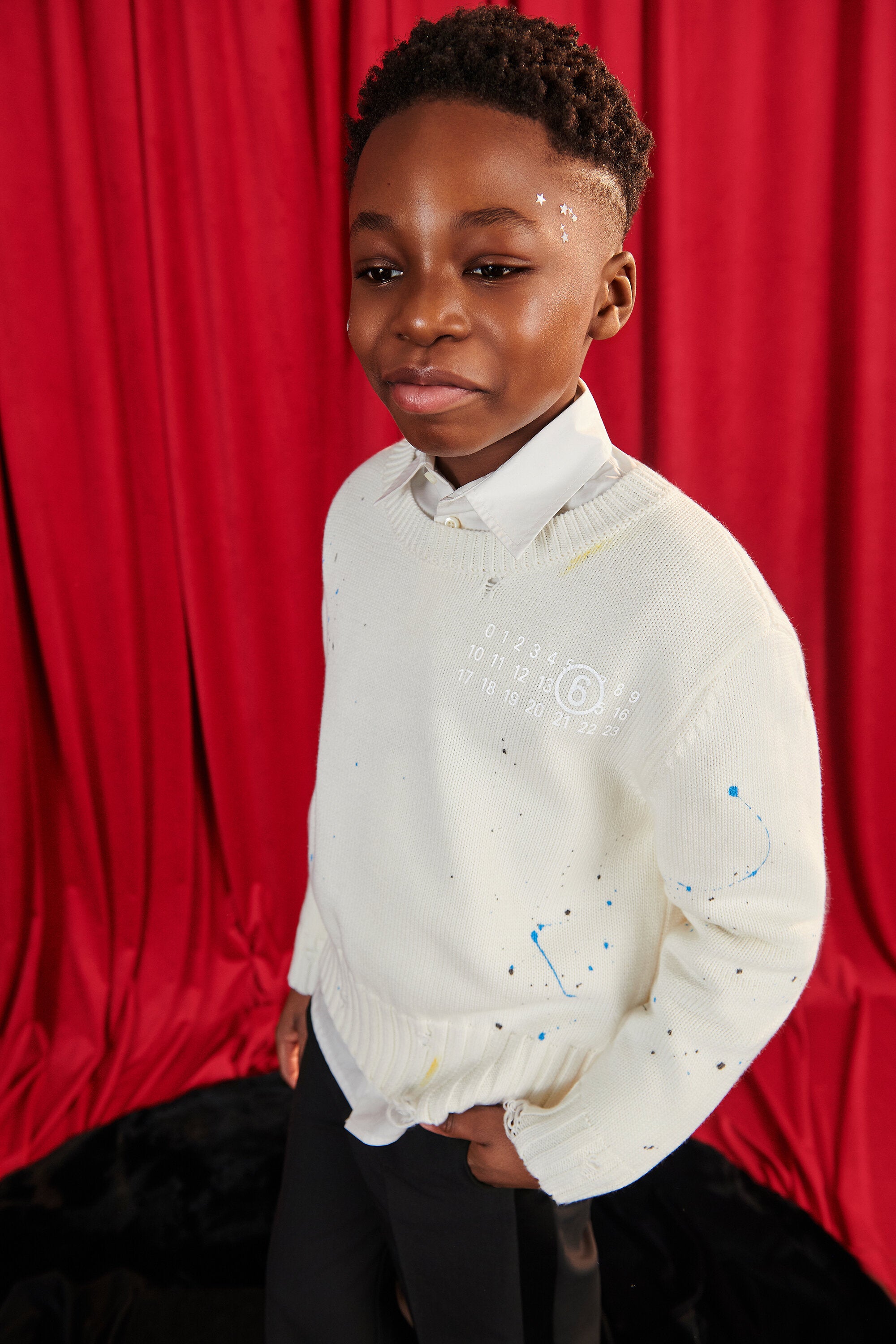 Crew neck pullover in 100% cotton with contrasting painted-effect design.