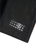 Nylon boxer costume. Short length. Drawstring waist. Numeric logo in contrasting color on front and back. Mesh inner briefs. Front welt pockets. Back pocket. Iconic seam at back.