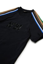 Soft cotton jersey T-shirt with multicolor bands along the sleeves. The contrast between the shiny logo print and sporty details makes the garment perfect for everyday looks.