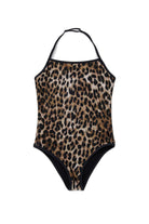 One-piece swimsuit with animal print. Modern design with halter neckline and contrasting edges.