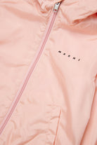 Windbreaker with printed logo, fixed hood, and clean lines.