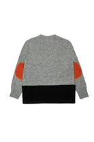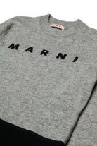 Long-sleeved crew-neck pullover in a wool blend featuring an original colorblock design with contrasting construction and elbow patches. The Marni logo on the chest adds a distinctive touch.