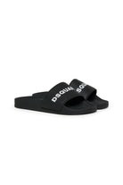 Slide sandals with contrasting logo. Featuring a single strap and flat sole.