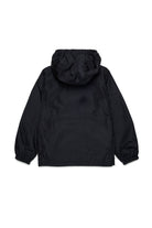 Windjacke mit aufgedrucktem Logo und Kapuze, gekennzeichnet durch klare Linien und elastische Details an Ärmeln und Saum.