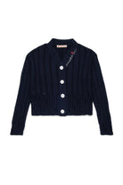 Langärmelige Strickjacke aus Rippenstrick mit lokalisierten Rissen. Marni Flower Logo in Kontrastfarbe am Kragen. Knopfverschluss vorne. Hergestellt aus 100% Baumwolle.