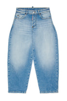 Relaxed-Jeans aus hellem Denim, gekennzeichnet durch einen weiten Schnitt und eine Gesäßtasche mit Lederimitat-Patch.