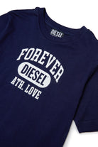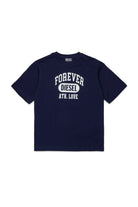 T-Shirt aus 100% Baumwolle mit Front-Print. Das Modell zeigt einen College-Schriftzug auf der Vorderseite.