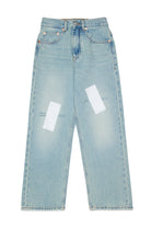 Regular Jeans aus hellem Denim mit leichten Used-Effekten und dekorativem Aufnäher auf den Beinen.