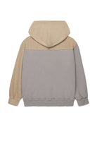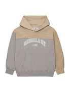 Kapuzensweatshirt, gekennzeichnet durch kontrastierende Einsätze an Schultern und Ärmeln sowie einen großen, auf der Brust gedruckten Logo-Print.