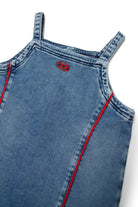 Kurzes Denim-Kleid mit Oval-D-Logo und Kontrastnähten, charakterisiert durch eine A-Linie und schmale Träger, die einen modernen und markanten Touch verleihen.