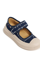 Niedrige Mary-Jane-Turnschuhe mit einem Riemen an der Oberseite. Auf der Rückseite ist das Logo der Institution in Kontrastfarbe aufgedruckt. Obermaterial aus dunklem Denim aus 100% Baumwolle. Innenfutter aus Kalbsleder. Thermoplastische Gummisohle. In Italien hergestellt.