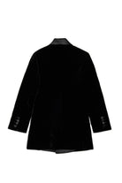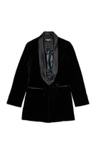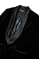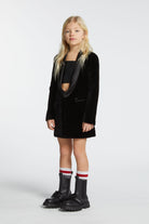 Minikleid aus Samt mit Revers aus Satin und mattschwarzer D2-Metallplakette auf der Vorderseite. Das innere Oberteil aus beschichtetem Stoff, das mit Knöpfen geschlossen wird, verleiht eine Dimension von Komfort und Stil. Ein raffiniertes Kleidungsstück, perfekt für besondere Anlässe.