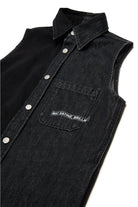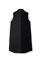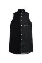 Ärmelloses Midikleid mit Rundhalsausschnitt in dunklem zweifarbigem Denim und Schwarz. Schriftzug "Mat, Satiné, Brillant" in Kontrastfarbe auf der Brusttasche. Knopfverschluss vorne. Kultige Naht am Rücken. Hergestellt aus 100% Baumwolle.