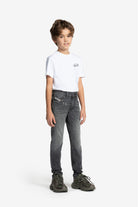 Slim Fit Jeans 1995 aus grauem Denim mit Abnutzungseffekt und ikonischer Attitüde. Ein slim fit Modell mit straight cut Bein. Eine Jeans für Denim-Liebhaber, die sich für jede Situation eignet.