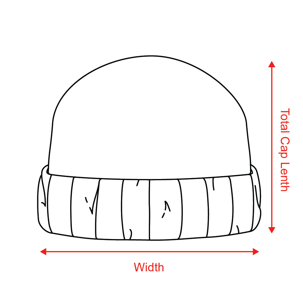 - Größe II: 21 cm breit, 16 cm lang, 20 cm Gesamtlänge der Mütze, 4 cm Umschlagshöhe