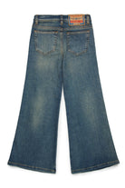 Five-pockets Jeans mit flare fit und Disco-Attitüde. Mid-waisted. Aus blauem Used-Effekt-Denim, der sich durch Farbverläufe, Whiskers und farblich abgesetzte Nähte auszeichnet. Das Design verfügt über einen verstellbaren Bund und einen elastischen Verschluss.