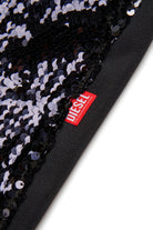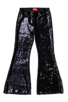 Flare-Hose mit Paillettenapplikation auf der Vorderseite. Die Stoffkombination schafft einen Kontrast zwischen Vorder- und Rückseite, während die beweglichen Pailletten bei jeder Bewegung einen dynamischen Effekt erzeugen. Ein perfektes Kleidungsstück für Partys und besondere Anlässe.