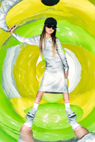 Langes, schmal geschnittenes Kleid mit Polokragen. Ein Kleidungsstück, das Eleganz und Modernität vereint, mit einem superglänzenden mylar-Finish für einen unverwechselbaren Look.
