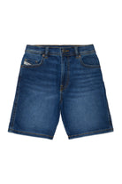 Shorts aus mittelblauem Denim mit Kontrastnähten und fünf Taschen.