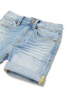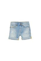 Jeans kurze Hose. Hergestellt aus hellem Stretch-Denim, der sich durch Farbverläufe, Whisker und farblich abgesetzte Nähte auszeichnet. Ausbesserung auf der Vorderseite. Unten mit Roll-up.