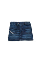 Falda corta en denim azul oscuro con efecto desgastado. Perfecta para un conjunto informal pero sofisticado, se puede combinar fácilmente con diferentes estilos.