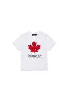 Camiseta de manga corta de suave jersey de algodón con logotipo Sport donde la hoja de arce canadiense, símbolo icónico del universo Dsquared2, se reinterpreta con un acabado flocado de efecto arruinado. Una prenda que combina estilo y practicidad.