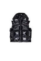 Brillante chaleco acolchado con capucha y goma con el logotipo de la hoja de arce, que recuerda la identidad canadiense de la marca. Ideal para añadir un toque de estilo a los conjuntos informales.
