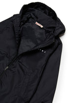 Cazadora cortavientos con logo estampado y capucha, caracterizada por líneas limpias y detalles elásticos en los puños y el bajo.