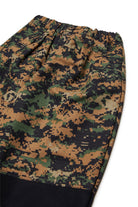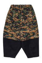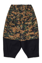 Chinos oversize inspirados en la marina americana. Corte globo con cordón en los tobillos y pinzas delanteras en la cintura, en tejido de camuflaje pixelado con detalle de corte a la altura de la pantorrilla y contraste negro.