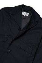 Abrigo de un solo botón con logo y emblemática costura en la parte trasera. Modelo de diseño esencial con cuello amplio y bolsillos frontales inclinados.