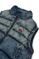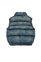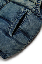 Chaleco acolchado de invierno en denim de efecto sucio, una prenda con un aspecto arenoso y contemporáneo. La base de denim lavado, realzada por la pulverización, confiere a la prenda un aspecto vivido y contemporáneo. Ideal para quienes buscan un estilo auténtico y original.