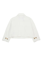 Chaqueta cropped cruzada con el logo bordado en el puño. El modelo presenta hombros estructurados, botones en los hombros y cierre frontal.