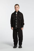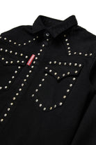 Camisa de manga larga en denim negro. Las tachuelas aplicadas en la parte delantera y trasera a lo largo de las costuras convierten esta camisa en una prenda refinada y llamativa.