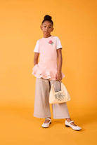 Vestido mini con logo y rosa bordada en el pecho, adornado con apliques de lentejuelas y volante en el bajo.