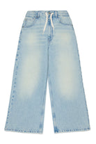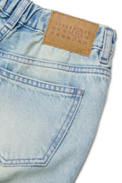 Jeans flare de denim azul claro. El modelo presenta un diseño de cinco bolsillos con cintura regular y elástico en la parte trasera. Icónica costura en la parte posterior.