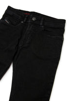 Vaqueros de cinco bolsillos con corte skinny y actitud punk. Cintura baja. Realizados en denim negro suave. Con el logotipo "D" bordado en color de contraste en el bolsillo trasero. El diseño presenta una cintura ajustable y cierre elástico.