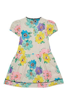 Vestido corto con logo y maxi estampado de flores multicolor. La silueta es evasé con corte en la cintura y mangas cortas fruncidas.