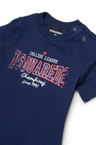 Camiseta de cuello redondo de manga corta confeccionada en jersey. Estampado de estilo universitario con efecto vintage en la parte delantera. Práctico cierre de botón en el hombro. Realizada en 100% algodón.