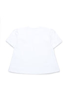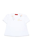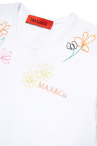 Camiseta de punto 100% algodón con mangas globo. Cuello redondo rodeado de bordados floral en la parte delantera. Logotipo MAX&Co. bordado en contraste de color en la parte delantera, en el lado del corazón.