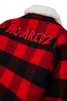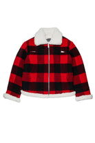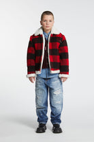 Chaqueta de piel de oveja de manga larga en suave franela a cuadros con interior de peluche. Una mezcla de comodidad y carácter, con bolsillos multiusos y un logotipo de temática de terror en la espalda.