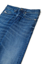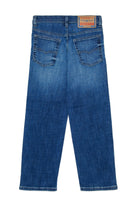 Jeans relaxed de denim azul medio de cinco bolsillos con un diseño limpio.